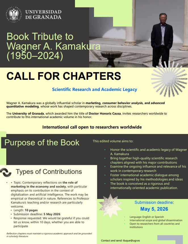 Nos complace informarte de la celebración del homenaje póstumo al profesor Wagner A. Kamakura, que tendrá lugar el próximo 11 de junio de 2026 en la sala de grados de la Facultad de Ciencias Económicas y Empresariales de la Universidad de Granada. En el archivo adjunto encontrarás la información detallada sobre los actos previstos, que incluirán una mesa redonda sobre marketing, digitalización e inteligencia artificial, la presentación del libro homenaje, la presentación de «Imágenes de una vida académica» y un encuentro posterior entre los asistentes compartiendo una comida en el Carmen de la Victoria, frente a la Alhambra.